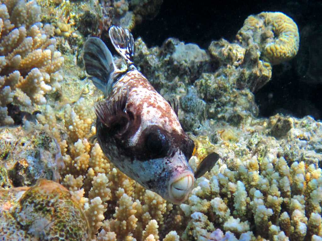 You see 4 strong arothron's teeth. On the photo the arothron aims to a coral. For not to injure its lips it opens them quite widely.