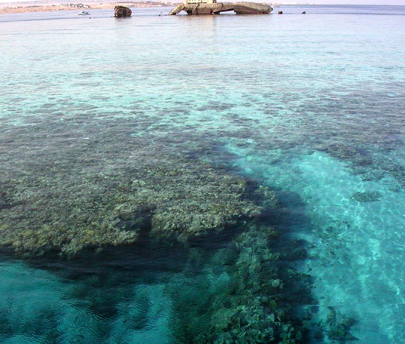 Coral reef is a hill on sea bottom, which reaches sea surface, that is dangerous for ships. Because of rare rains, lack of rivers and still sea the water is always transparent here. Transparent water is seen at bottom side of the picture. At top side you see an old Soviet? tanker. The photo was taken near Tyrant island. This old ship is well seen through a binocular from hotels Conrad and Baron .