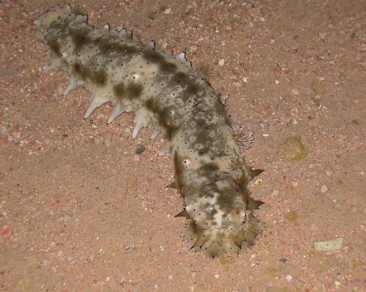Это ночное фото сделано не под водой. Голотурия (морской огурец, трепанг) замечена рядом с берегом на глубине 50см когда я шёл по пляжу. Я фотографировал эти существа в глубине, и видел их брачные танцы, когда они стоят вертикально и раскачиваются, еле держась за камень. Но в глубине не были видны цвета.