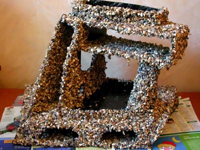 Видимая часть поверхности грота покрыта камушками из аквариума, которые сначала надо вымыть, прокипятить, и высушить (в духовке), чтобы улучшить схватываемость с клеем. В качестве клея использовался прозрачный аквариумный герметик.
