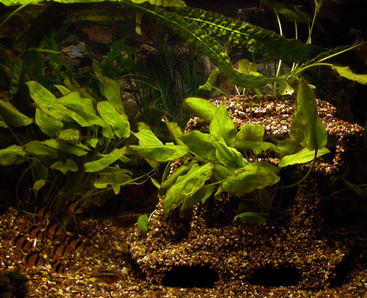 Наконец, грот для аквариума сделан своими руками, помещён в воду и украшен растениями. Цихлиды и сомы постоянно живут внутри грота. Даже барбусы туда заплывают.