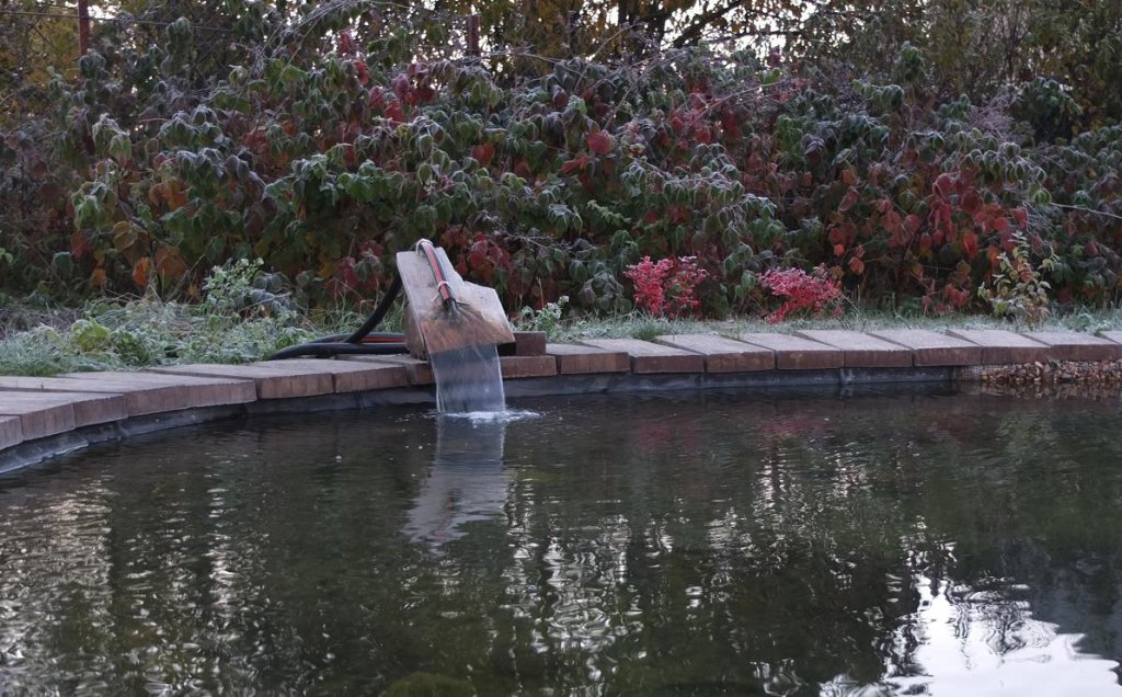 Одна из экологических идей состояла в том, чтобы в пруду не было никакого оборудования вроде скиммеров, фильтров, фонтанов, труб, кабелей. Вся конструкция должна переносить зимние условия без вынимания насосов, проводов или шлангов. Достаточно выключить насос колодца, если подземный шланг замёрзнет. Морозостойкий шланг к водопаду проложен по канавке под берегом. Фильтр расположен вне основного пруда в "нижнем пруду" глубиной 30см. Насос фильтра находится на глубине больше метра, и не замерзает, как и насос колодца. Их не надо убирать на зиму.