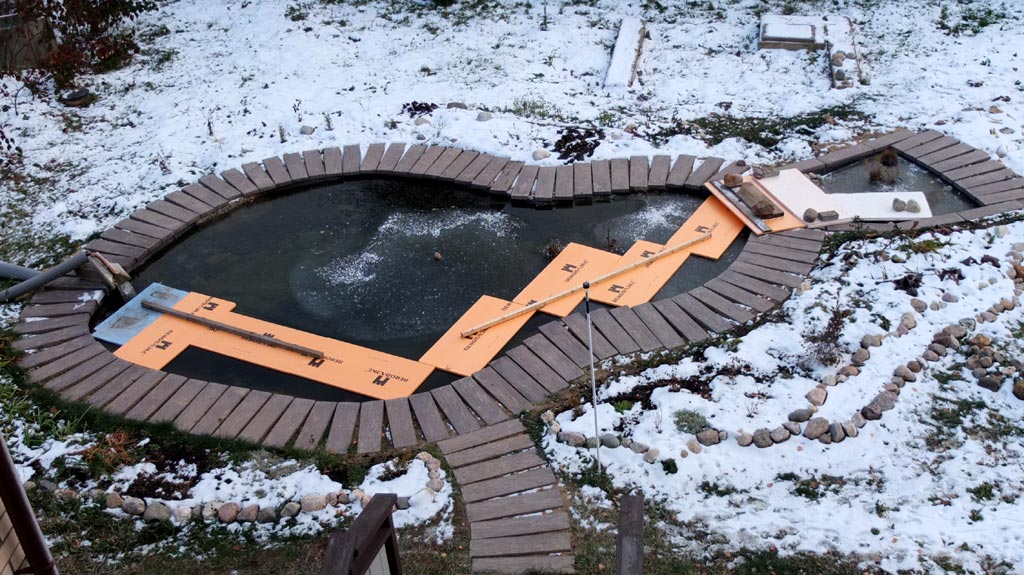Я утеплил открытую часть трубы, подающей воду на водопад, утеплил место перелива из большого пруда в нижний "пруд фильтра", утеплил пенопластом входную решётку фильтра, и положил пенопласт вдоль незамерзающего течения, так как именно здесь самые большие потери тепла.