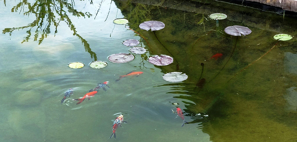 За последние 4 года никаких ремонтов пруда не было, только один раз заменили насос. Вокруг пруда буйные заросли. В центре пруда тоже полно кувшинок. Приходится их жёстко пропалывать. Из-за большого количества водных растений этой зимой погибли несколько рыб, так как зимой растения гниют на дне. Когда это обнаружилось, я почистил пруд от ила, и буду делать это каждый год. В этом году я отнес одну кувшинку на соседний общедоступный пруд. Таких прудов и речек в окрестности достаточно, но кувшинок там нет. А у меня теперь кувшинок много, и можно распространять красивое растение.