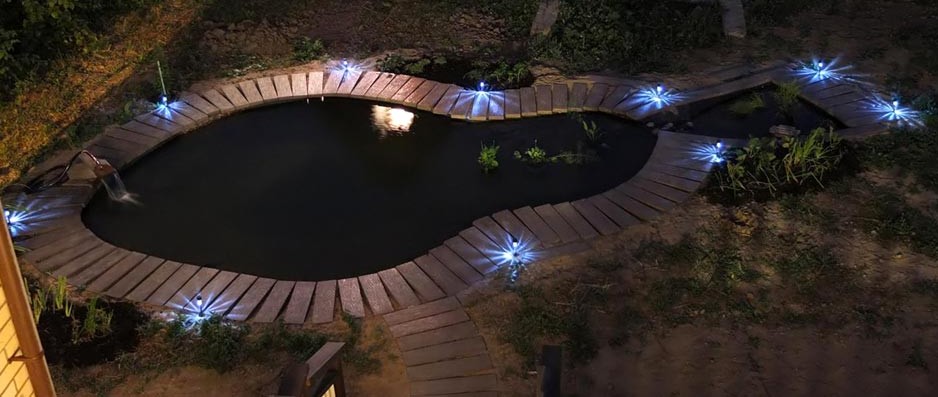 Система подачи и циркуляции воды, водопад, первое заполнение пруда водой описаны на странице Вода для пруда