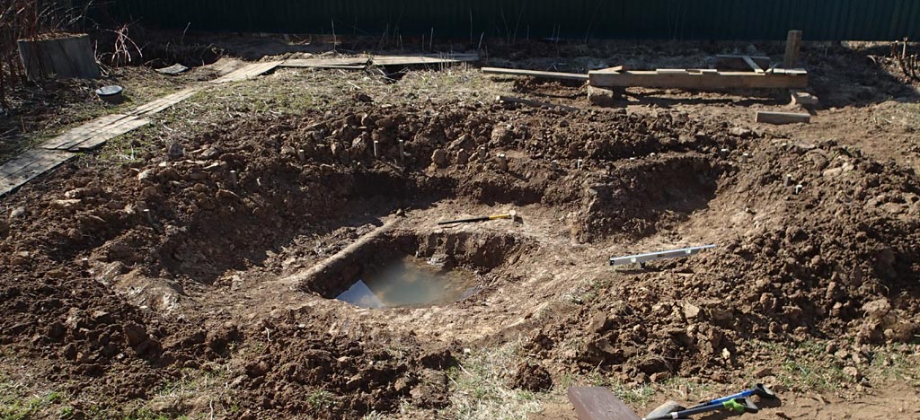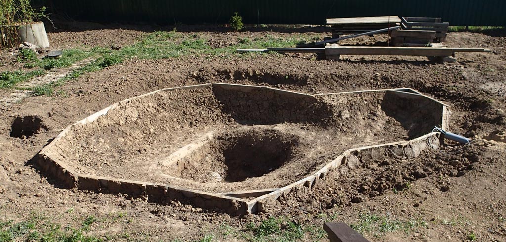 При диаметре ямы 5м я решил, что это достаточно гармонирует с домом (9х9м). Обсудив и обсмотрев яму со всех сторон, мы решили, что она слишком круглая, и я выкопал ещё неглубокую ямку по колено, так что в плане получилась форма груши.