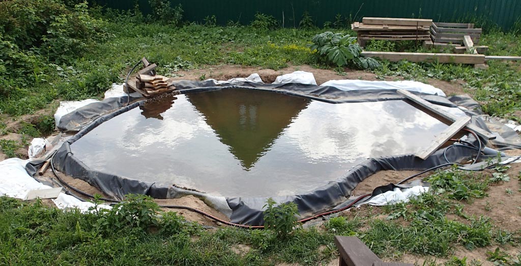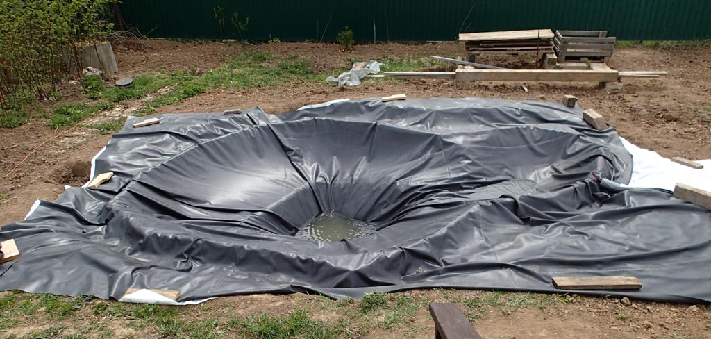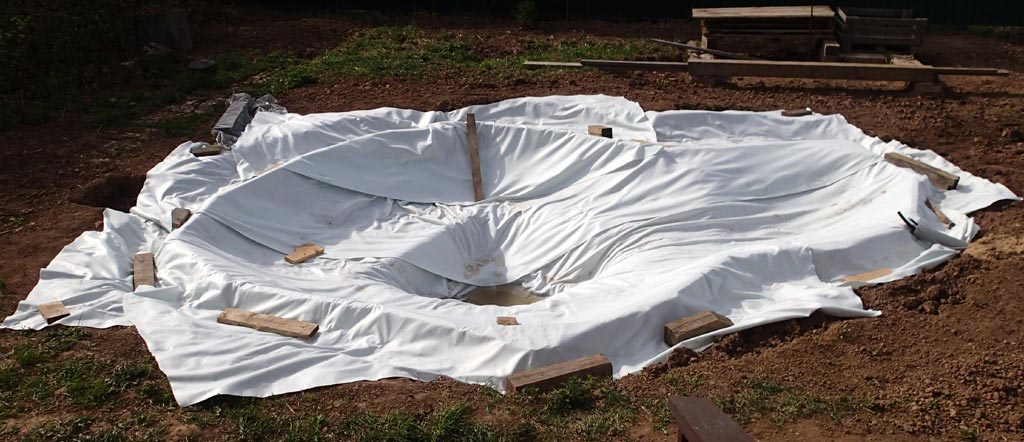 После выравнивания дна нужно положить на него плотный геотекстиль и бутил-каучуковую плёнку (резину).
