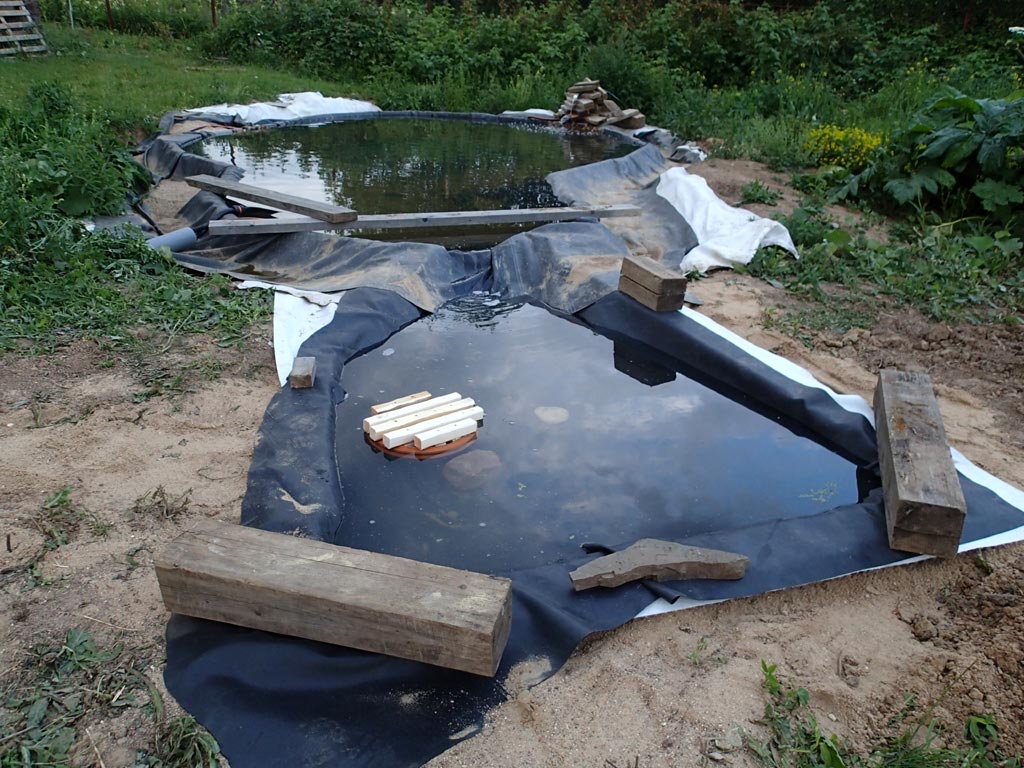 Яму нужно было увеличить, чтобы добиться гармоничного размера, не слишком маленького, и не слишком большого по сравнению с домом и участком. Выкопанную землю и глину использовали для улучшения горизонтальности берега пруда. Уровень примерно задавался колышками, временно забитыми вдоль будущего берега.