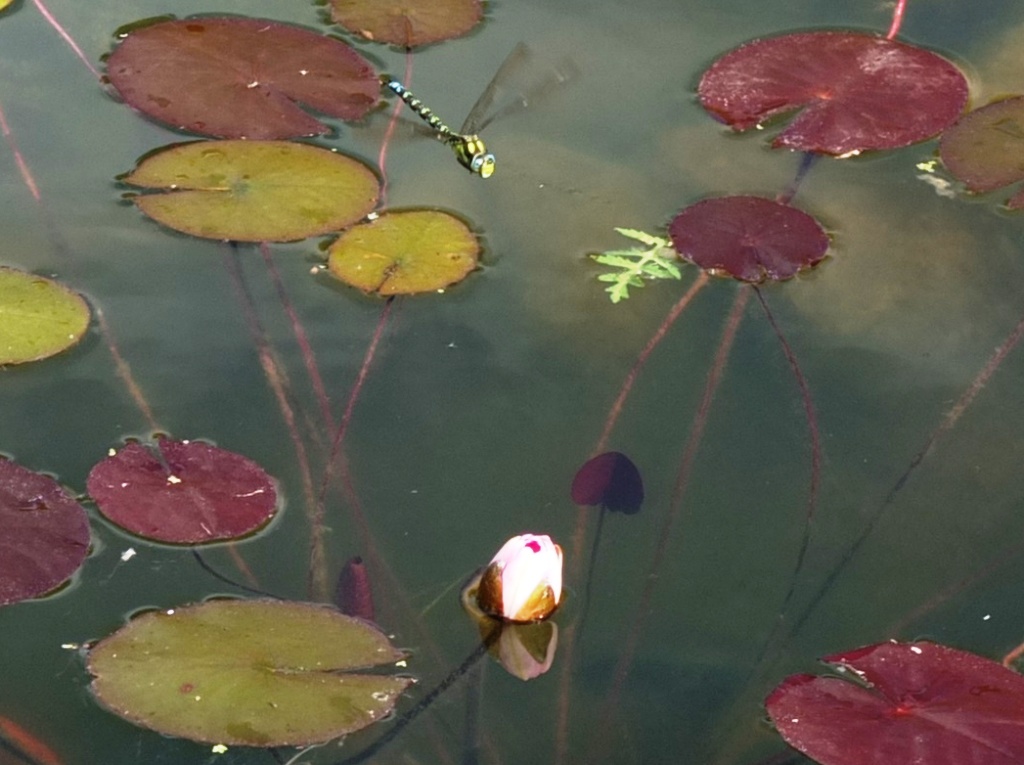 Ещё в мае, сразу после заполнения пруда водой, я вылил в него ведро воды из речки с жуками, улитками, дафниями, личинками, мальками и растениями. Из страшных личинок стрекозы вывелись большие стрекозы. Раньше у нас на даче я таких стрекоз не видел. Растения стали размножаться, а живность расплодилась, и чувствует себя хорошо.