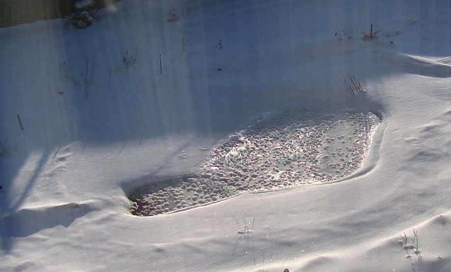 Оказалось, что в моей системе циркуляции вода довольно долго течёт под землёй и согревается. Поэтому пруд только немного покрылся льдом, но так и не замёрз весь, хотя уже пару раз ночью было -12 градусов. На местной речке лёд уже крепкий, и множество рыбаков сидят около своих лунок, поджидают рыбу.