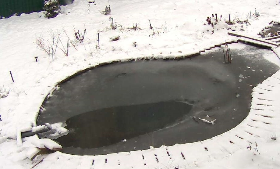 Лёд полностью покрывает пруд только при -15 ... -20 градусах. Бывает, что при -15 градусах остаётся полынья без льда размером около метра, сквозь которую можно разглядеть красных рыбок.
