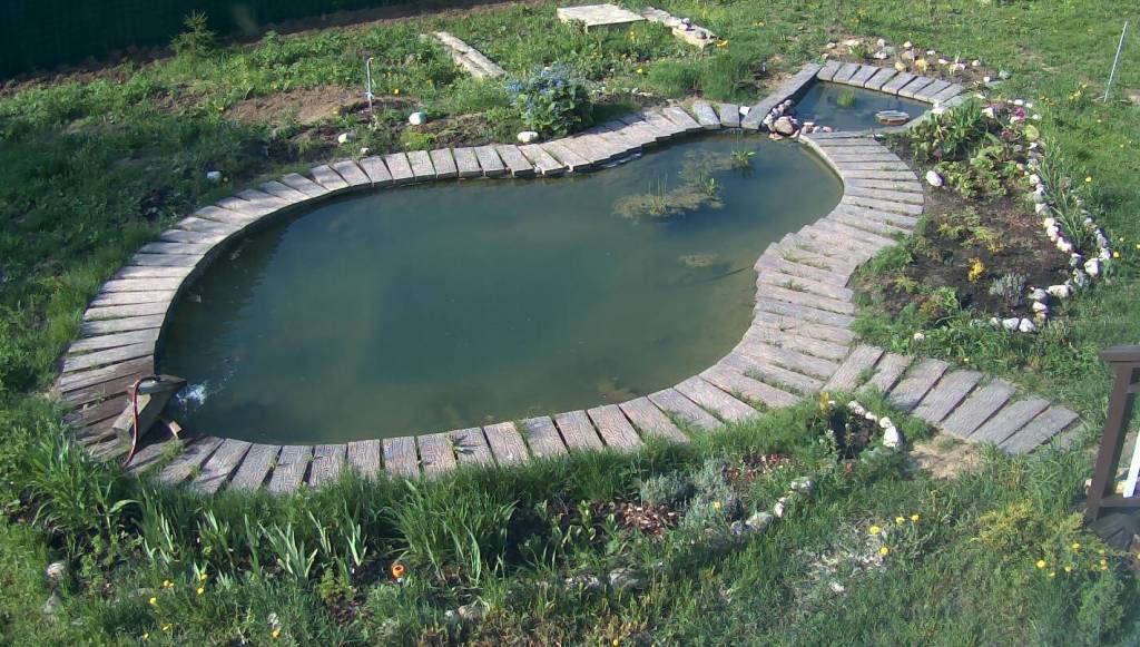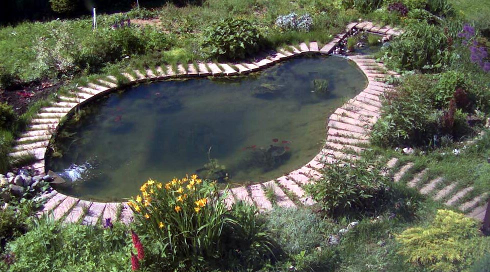 Я выкопал на участке пруд лопатой. Завел там рыбок и кувшинки. Для поддержания уровня воды сделал водопадик и циркуляцию воды через фильтр. Все вышло почти случайно после прокладки дренажных труб вокруг дома, и после удаления огромного куста ивы. Смотрите страничку Как на месте куста получился пруд. После куста осталась некрасивая большая яма. Чтобы труд не пропал напрасно её решили превратить в пруд.