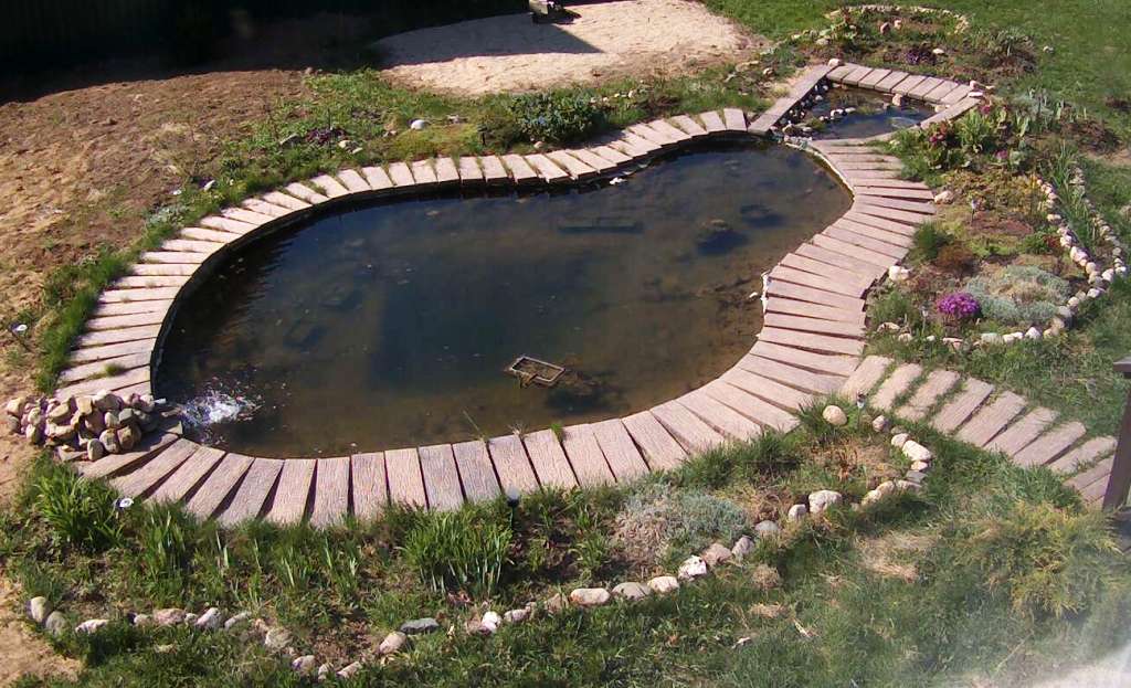 Я сделал прочную кромку пруда (линию берега) из доски 5x15см прибитой к колышкам забитым на 60-80см. Выбор сечения доски обоснован только тем, что таких досок осталось много после окончания стройки. Из них же я сделал 2 дровника, использую их для ремонта сарая и забора, недавно делал из них подпорные стенки для траншеи.
