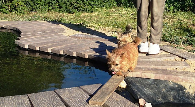Воду для наполнения пруда берём из колодца. Для красоты и для насыщения воды кислородом в пруду должен быть водопад. Для очистки поверхности пруда от одуванчиков, листочков и случайного мусора должен быть постоянно работающий фильтр. Это не плавающий в пруду скиммер , а отдельное устройство, которое находится вне основного пруда, так как в пруду не должно быть ни проводов, ни шлангов, ни насосов. Вода из пруда стекает через понижение бортика в сторону фильтра, и затем попадает в фильтр. Так мусор с поверхности пруда уносится течением в фильтр, и он выполняет функцию скиммера.